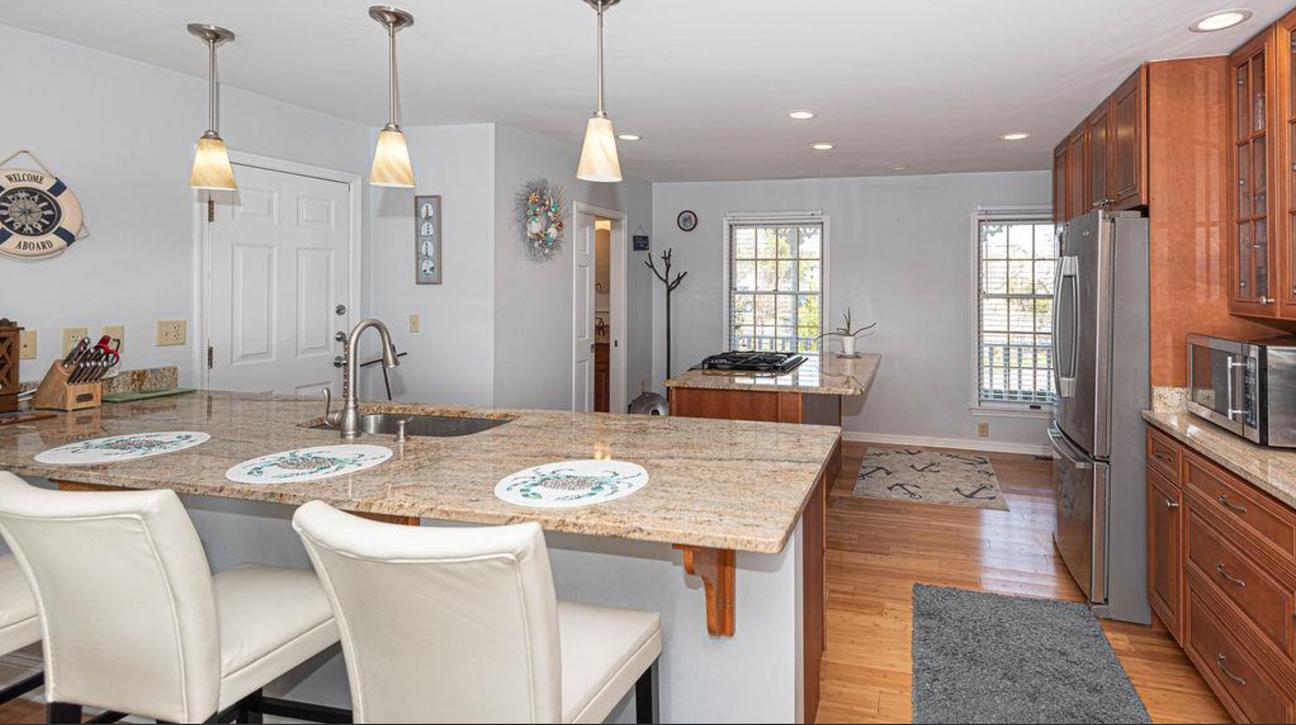 Inside, the home is bright and welcoming with an open layout that’s perfect for spending time together. The living area is cozy yet spacious, featuring comfortable seating and large windows that bring in natural light and water views. The fully equipped kitchen offers plenty of room to cook and gather, with generous counter space and everything you need for family meals or casual dinners after a day on the water.